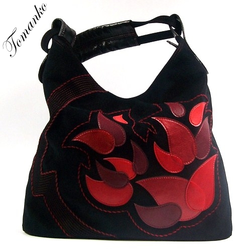 Duża pakowna torba, wykonana z wysokiej jakości zamszu ekologicznego. Jest pięknym połączeniem głębokiej zamszowej czerni z czterema odcieniami czerwieni od ciemnej stonowanej po jaskrawą. Całość daje zaskakujący efekt. Aplikacja torebki składa się z fantazyjnych kształtów, przypominających listki oraz z elementów zdobniczych w postaci sznurków w kolorze bordowym, czerwonym i czarnym, które zostały ręcznie przewleczone. Dopełnieniem kompozycji są bordowe szwy ozdobne. Torebka uszyta została w całości bordową nitką. Prace związane z wykonaniem elementów zdobniczych torebki są rękodziełem. Wszystkie elementy torebki oraz aplikacji ozdobnej były wycinane ręcznie.