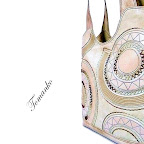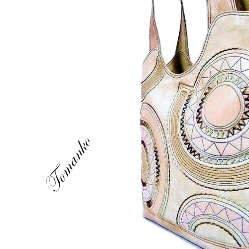 Torebka unikatowa, inspirowana pięknem amonitowych skamieniałości. Wykonana z wysokiej jakości skóry ekologicznej lakierowanej w kolorze kremowym (przód i tył) oraz skóry ekologicznej z lekkim połyskiem cieniowanej kolorami kremu i beżu (spód i rączka). Torebka posiada aplikacje ozdobne w kolorach połyskującego kremu i beżu przypominające kształtem skamieniałe muszle amonitów. Całość wzbogacona jest cieniowanym sznurkiem ozdobnym ręcznie przeplatanym. Z tyłu torebki znajduje się kieszonka zapinana na zamek błyskawiczny. Tonacje kolorów torebki zmieniają się pod wpływem padającego światła. W słońcu torebka wydaje się jaśniejsza i bardziej się błyszczy niż w cieniu. Prace związane z wykonaniem elementów zdobniczych torebki są rękodziełem. Wszystkie elementy torebki oraz aplikacji ozdobnej były wycinane ręcznie.