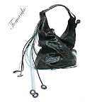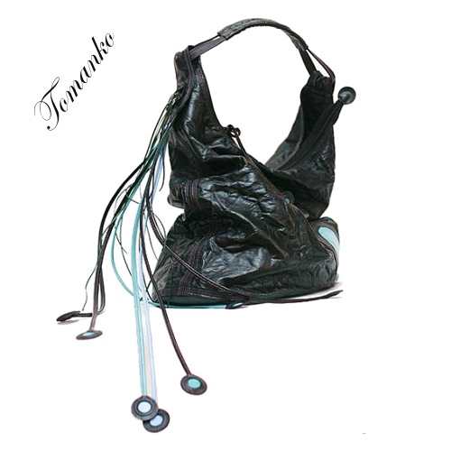 Duży, pakowny worek, wykonany z wysokiej jakości skóry ekologicznej, która posiada fabryczne zagniecenia. Jego ozdobą są kolorowe aplikacje w kształcie koła oraz frędzle zakończone małym kółkiem imitującym pawie oko. Całość jest wykonana w kolorze czarnym, natomiast aplikacje w błękicie i turkusie.